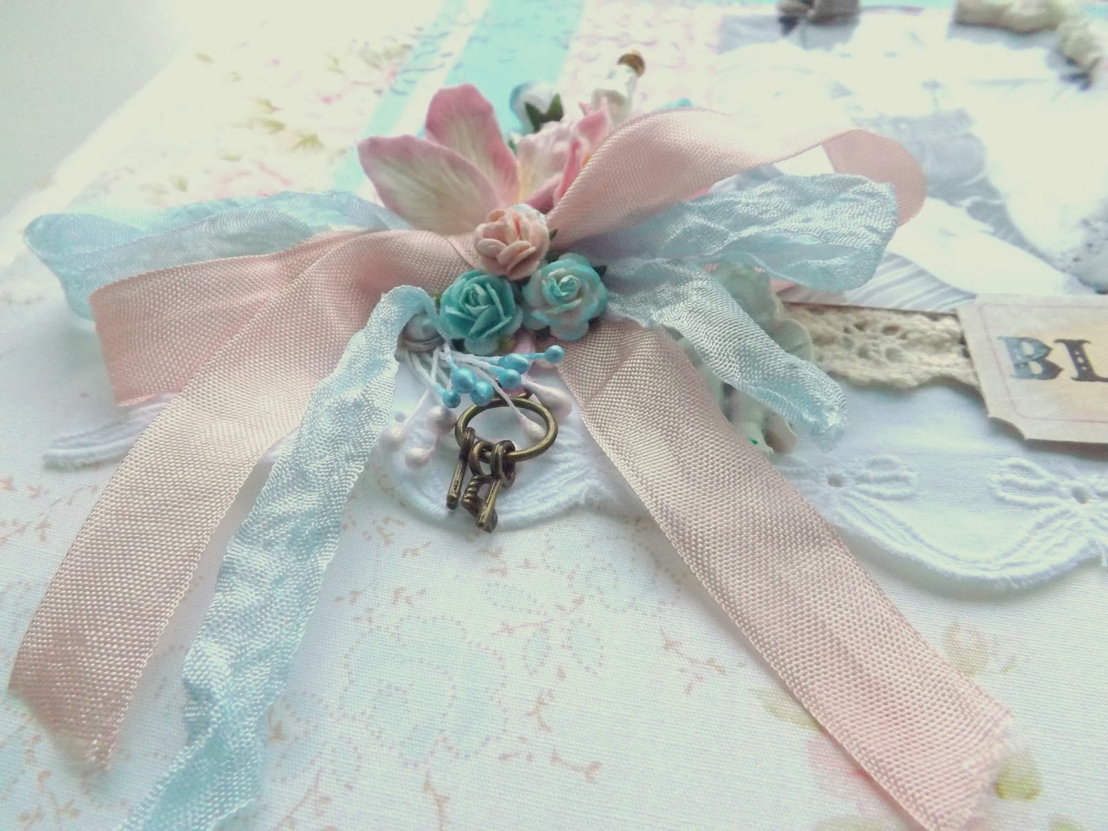 Мягкая страничка из нежнейшего корейского хлопка проложенная для мягкости синтепоном, с сочетанием голубого и розового, с цветами, шебби-лентами, хлопковым шитьем и кружевом, прищепочкой, бабочкой, чипбордом "Люстра", гипсовой рамочкой, подвеской "связка ключей", брадсами Прима, ангелочкой, текстурная паста и, конечно же, корона...